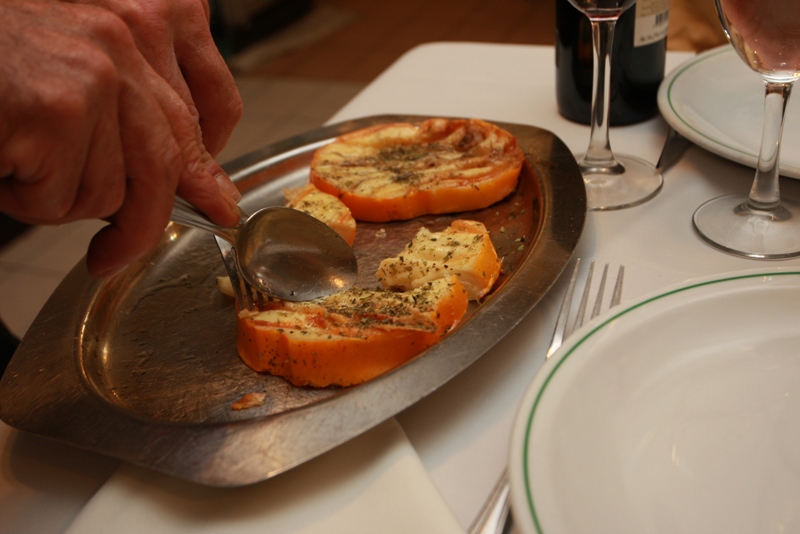 Arī 8:30 no saimnieka ne vēsts. Tikai galda piederumi visiem salikti vietās. Drīz arī viņš parādās un sākas neliela rosība. Neliela tāpēc, ka nesaprotam – kas īsti tiks piedāvāts. Uz galda ir sviests un ievārījums. Arī kruasāni ir. Bet vēl nesākam ēst, jo gaidām to šķiņķi un sieru. Gaidām. Viss smaržo – kafija, svaigā maize…nolemjam nemocīties un apēdam to kas ir. Tā, tikko tas ir noticis, saimnieks atnes šķiņķi. Atkal gaidām – vai būs vēl kāda maize, jo šķiņķi vienu pašu tā kā negribas. Nesagaidām. Garāmejot saimnieks vēl atnes dažādus sierus un pastāsta no kāda piena katrs gatavots. Viens stipri sāļš, otrs maigāks, svaigais siers, bet ar dīvainu piegaršu. Maizes nav. Beidzot saņemamies un apēdam arī šķiņķi un sierus. Nu viņš atnes maizi un jogurtu…